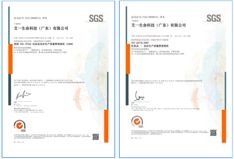 此次双认证的落地,是艾一生命科技品牌国际化布局的关键一步。美国FDA标准作为全球化妆品行业的重要准入门槛,其认可意味着公司产品可顺利进入北美及全球多个认可该标准的市场,为旗下品牌走出国门、拓展国际影响力奠定了坚实基础。ISO 22716:2007作为化妆品生产质量管理的国际通用准则,则进一步增强了品牌在国内乃至全球市场的信任度,为企业跨越国界发展提供重要支撑。艾一生命科技业务覆盖生命资源样本采集与储存、细胞创新药物研发、生产及全链条销售,此次认证为其全球化业务拓展提供了质量体系保障。