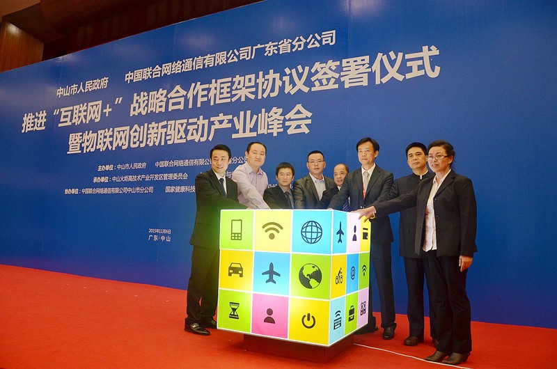 11月6日,由中山市政府、广东联通联合主办,火炬区管委会、中山市经信局承办,国家健康基地、广东司南物联股份有限公司协办的“推进‘互联网+’战略合作框架协议签署仪式暨物联网创新驱动产业峰会(中山)”在市政府会议中心举行。中山市委书记薛晓峰、中山市委常委、火炬区党工委书记、翠亨新区党工委书记侯奕斌、中山市副市长高瑞生以及国家健康基地总经理方迎、司南物联网总经理张力出席会议。