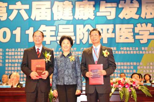 鍾南山(右)、韓濟生(左)獲得2011年吳階平醫學獎。全國政協副主席、吳階平醫學獎評委王志珍向兩位獲獎者頒發獲獎證書和獎章