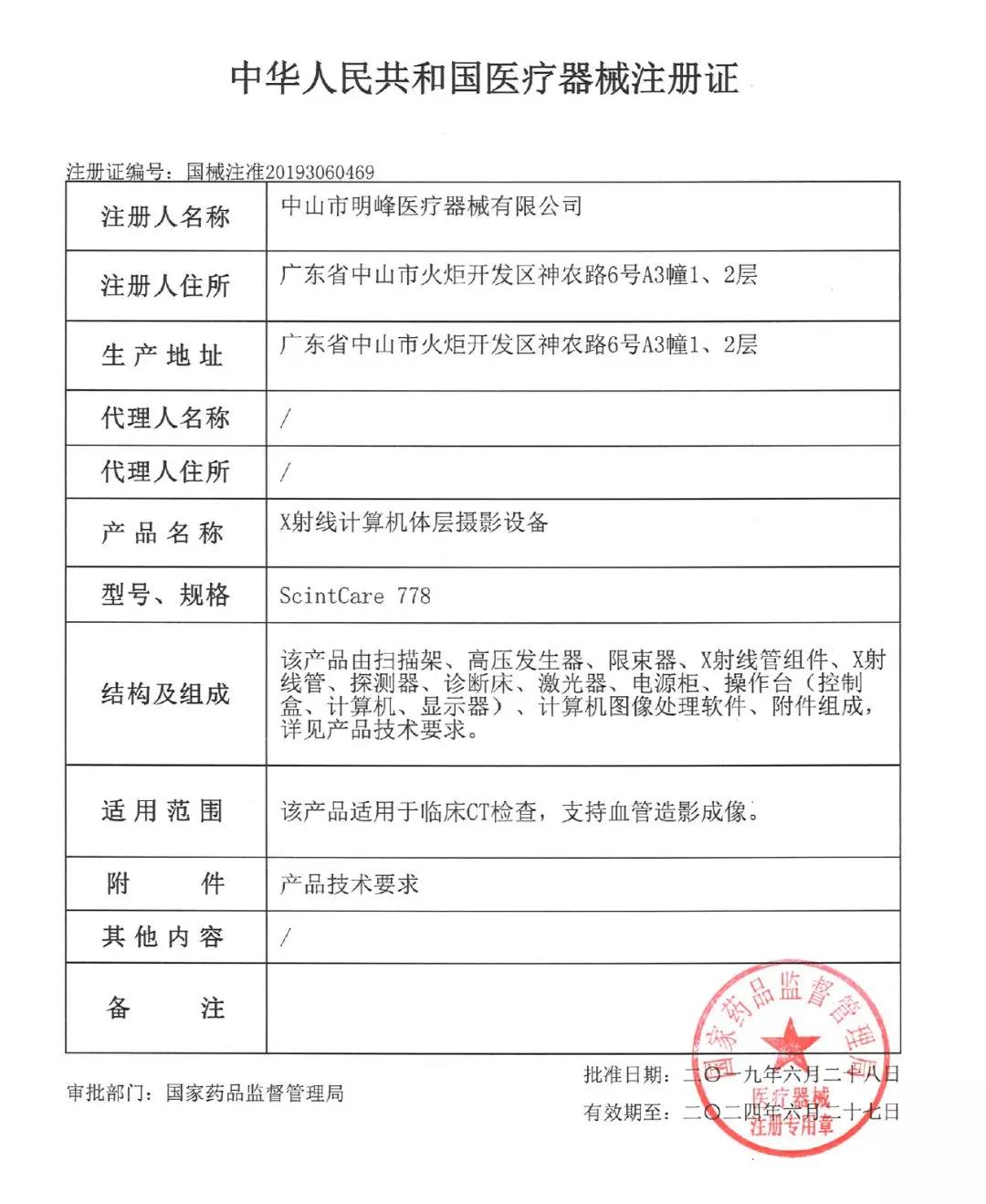近日,国家健康基地园区企业——中山市明峰医疗器械有限公司迎来喜讯,其自主研发的128层CT机获得了国家药品监督管理局颁发的医疗器械注册证。