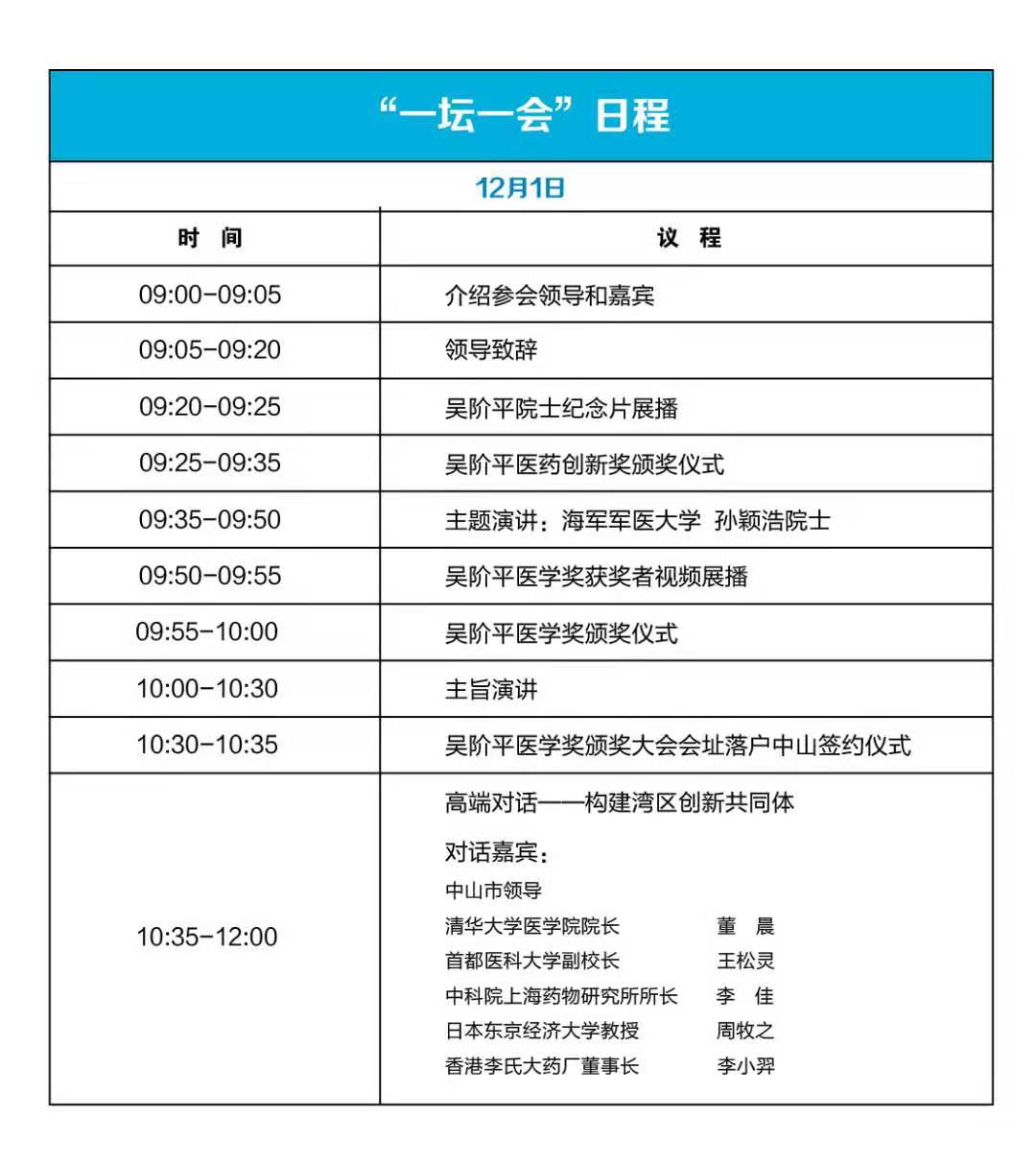 在开幕式上,将举行中山市人民政府和吴阶平医学基金会《建设吴阶平医学奖颁奖大会会址合作协议》签约仪式,这标志着吴阶平医学奖颁奖大会会址将落户中山。同时,还将举行院士主旨演讲、高端对话。高端对话将围绕“构建国际化创新型健康湾区的机遇、挑战”、“双区驱动战略下,中山建设生物医药科技国际合作创新区的举措”、“中山大力发展健康产业、融入湾区协同创新共同体路径”等话题展开。
