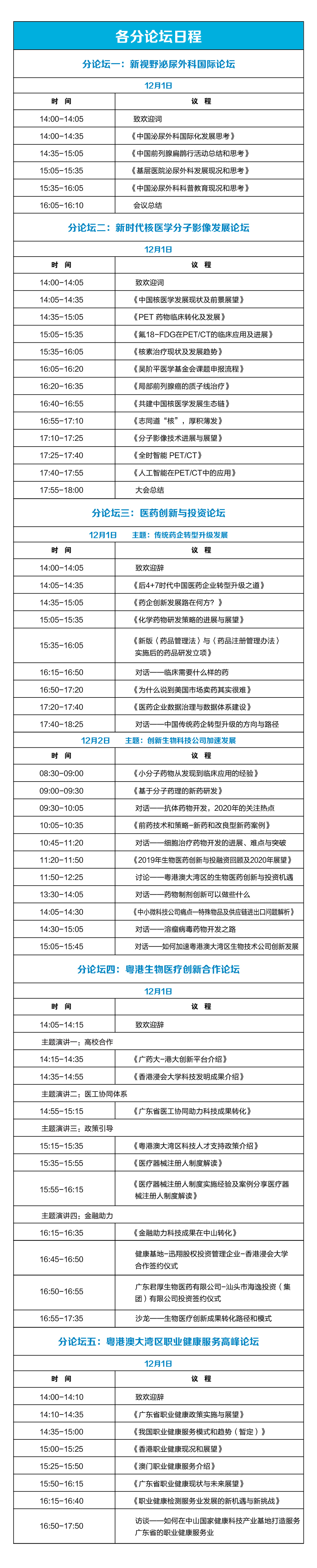 论坛开幕式和颁奖大会后将举行五个分论坛,其中有两个分论坛是由吴阶平医学基金会主办的医学学术论坛,分别是新视野泌尿外科国际论坛和新时代核医学分子影像发展论坛,将分别探讨我国泌尿外科和核医学的发展之路。另外三个分论坛均由中山方面举办,分别是医药创新与投资论坛、粤港生物医疗创新合作论坛,以及粤港澳大湾区职业健康服务高峰论坛。三个论坛与产业发展密切结合。医药创新与投资论坛汇聚医药界领军人物,围绕中国传统药企转型升级和粤港澳大湾区的生物医药创新与投资机遇,探讨资本市场助力,赋能传统药企,创新药物研发与多元化资本金融结合的产业创新模式;粤港生物医疗创新合作论坛以医疗器械注册人管理制度的具体实施、科技成果转化范例等话题,聚焦香港高校科研成果、广东医工协同创新联盟、金融科技助力等科技成果转化中的关键要素资源展开讨论,推动在中山构建“湾区技术+金融创新+中山落地产业化”模式;职业健康论坛重点就职业健康服务业的发展创新、促进职业健康相关产业发展进行深入研讨,交流探索新时期职业健康服务业的实践路径和发展模式,助力健康湾区建设。