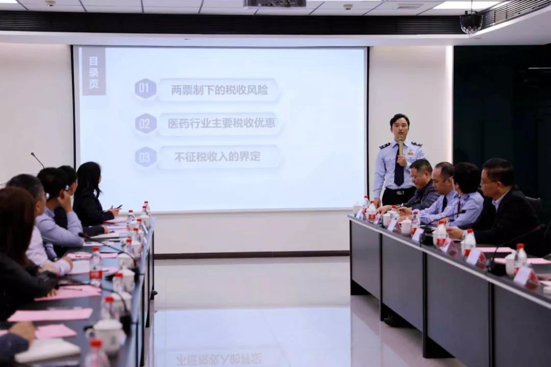 会上,开发区税务局税源管理一股副股长刘海山向医药企业代表介绍了两票制下的税收风险、医药行业主要涉及的税收优惠政策、不征税收入的界定等税收政策及医药企业关心的热点问题。并针对医药行业的显著特征,以案例分析了医药企业可享有的各种税收优惠。
