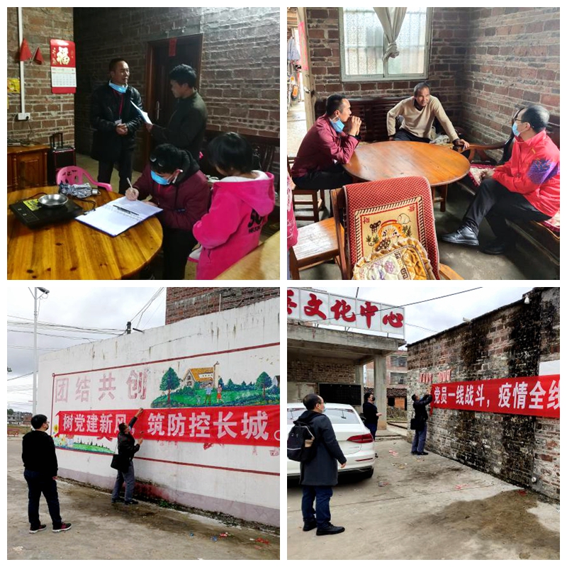 返回团结村后,驻村工作队主动会同镇村干部、党员、村医等开展疫情防控,一是加强宣传工作,在村张贴疫情防控宣传海报60多张和悬挂横幅10多条,向村民发放700多份倡议书,利用电子屏、广播等设备进行疫情防控宣传;二是设卡开展进出登记工作,在村口设卡,对进村人员登记并测体温,对于进村动机不明、身体状况异常的外来人员,一律不准进村。三是进村入户排查。成立“四个一”排查小组进村入户排查,发现“6类”人员马上做好登记,并把排查情况报镇政府。四是加强村卫生工作,定期对村道卫生进行整治,要求村民做到门前“三包”,保持村内整洁,减少细菌病毒滋生。五是加强巡查劝导,对村民聚集性群体活动进行劝导,解散取消,让村民居家过年,少出门,勤洗手,出门戴口罩。截止目前,全村排查出“6类人员”127人,其中E类(非当地村常住居民临时来肇人员并进入本村)126人,F类(村常住居民曾离开肇庆)1人。