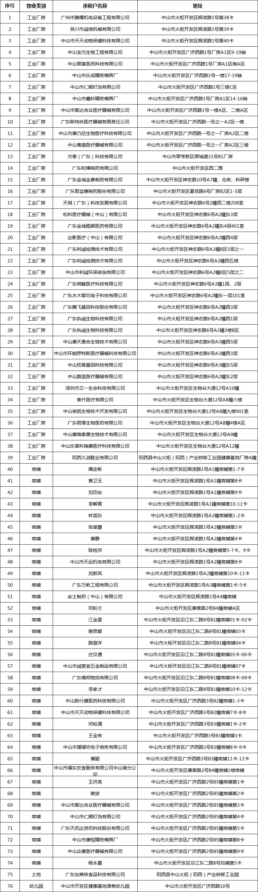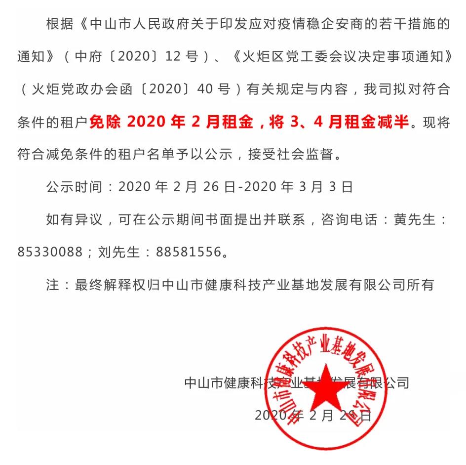中山市健康科技产业基地发展有限公司关于经营性物业、土地租金减免名单的公示