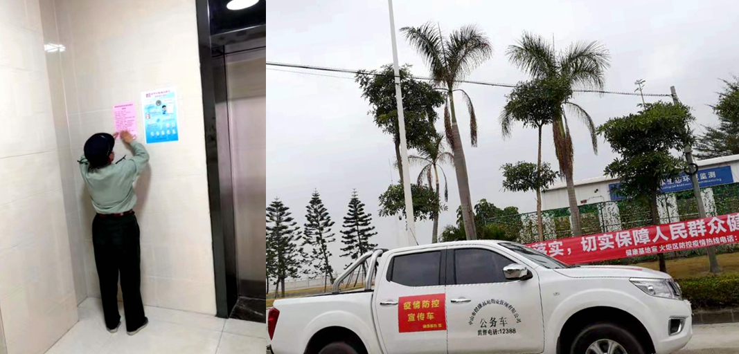 通过公司官网、微信公众号等网络宣传平台以及企业主群、党建群、工会群、团委群、宿舍住户群等转发各类宣传信息,如:《火炬区新型冠状病毒感染的肺炎疫情发生地来粤人员健康监测和管理指引》、《致火炬开发区企业的一封信》等宣传信息。到园区张贴1500份防疫知识宣传海报,自制300张通知、悬挂横幅58条张贴在园区所有的集体宿舍,在德仲广场LED屏和园区党群中心LED屏播放滚动视频,利用1台移动音响宣传车和5台固定音响的方式在园区广播。