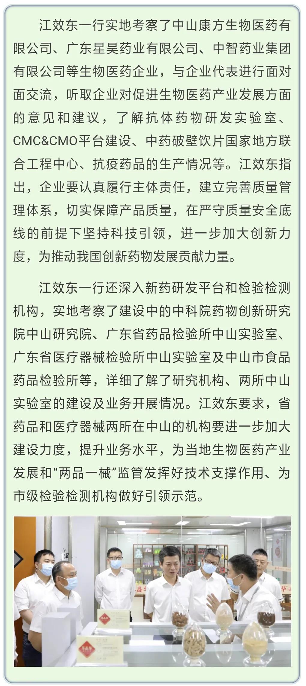 5月25日,广东省药品监督管理局党组书记、局长江效东一行赴中山市就生物医药产业发展与药品安全监管工作开展调研,实地考察了健康基地园区生物医药企业及研究和检验检测机构。中山市市委书记赖泽华、市长危伟汉、副市长雷岳龙参加了座谈交流。