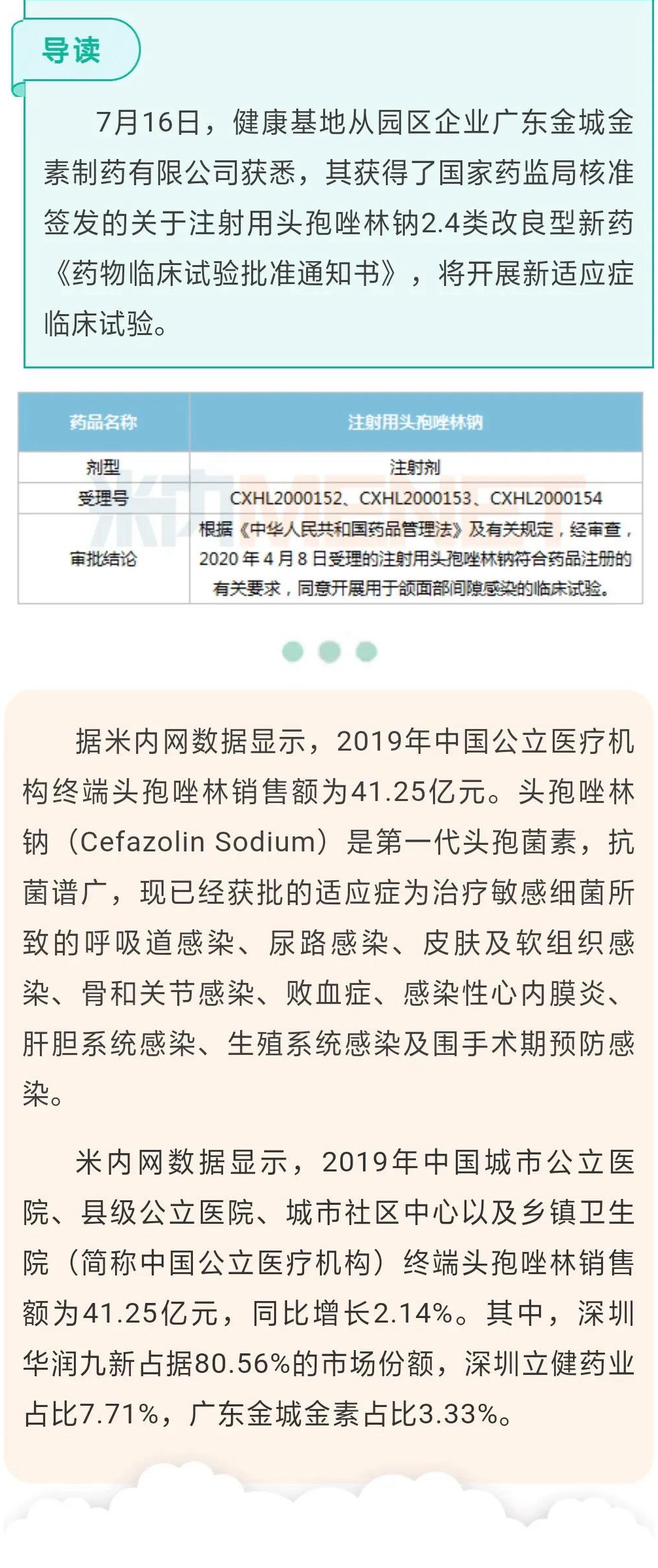 广东金城金素制药注射剂大品种新适应症获批临床