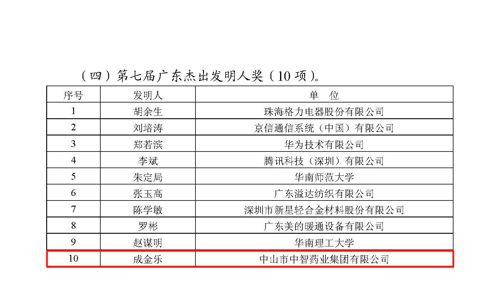 成金乐教授获得广东杰出发明人奖,体现了中智药业集团的知识产权管理工作的进步,体现了中智药业集团技术团队发明创造能力和中药破壁饮片的创新水平迈上更高的台阶,这将进一步驱动中智药业技术团队更加充分发挥自主知识产权优势,加强技术改进与创新,推动中药现代化和国际化发展。
