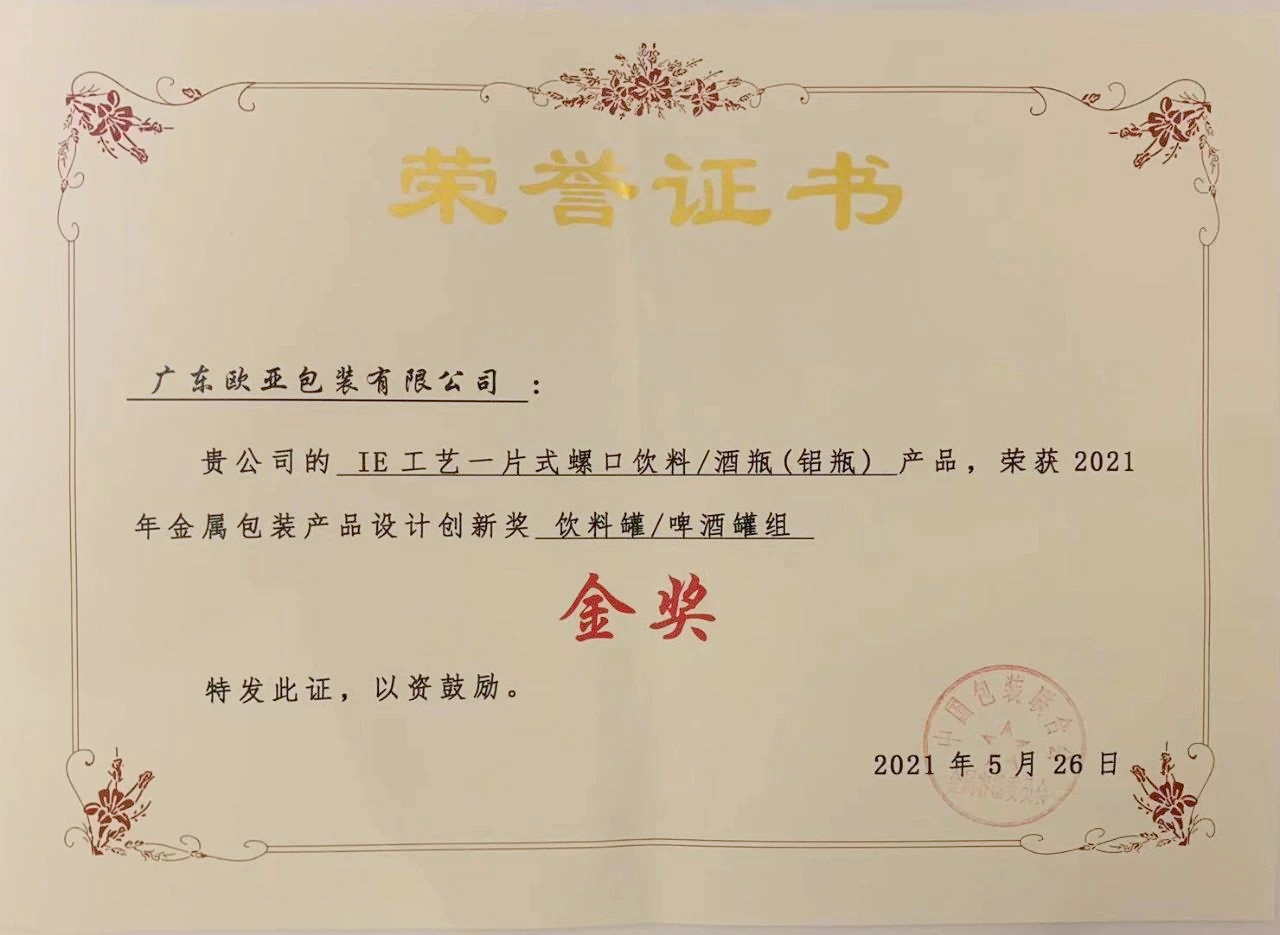 近日,在“2021年中国金属包装行业大会暨展览会”上,健康基地园区企业广东欧亚包装有限公司(以下简称欧亚包装公司)报送的“IE工艺一片式螺口饮料/酒瓶(铝瓶)” 在众多参评项目中脱颖而出,荣获“2021年金属包装产品设计创新奖金奖”。