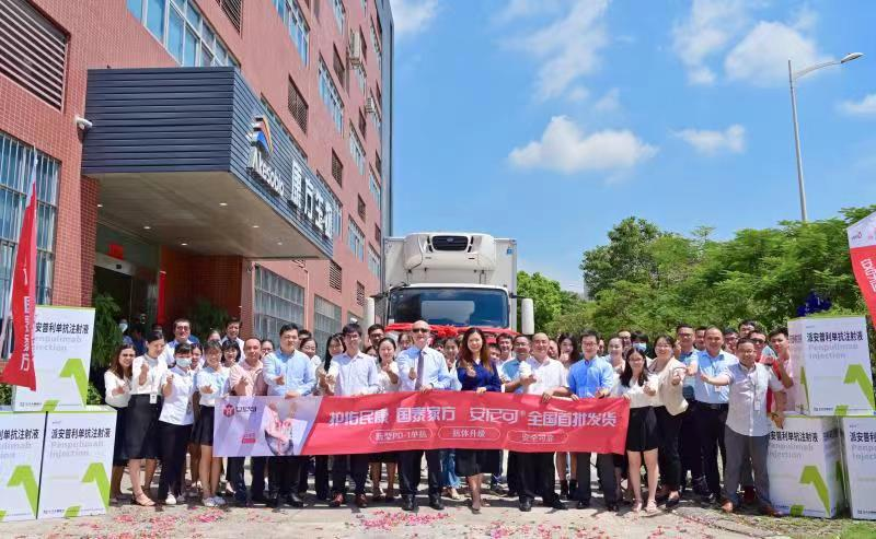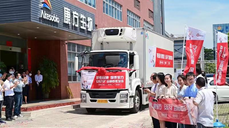 2021年8月21日上午10点30分,百花怒放、硕果累累的盛夏中山,满载逾20,000支新型抗肿瘤药物派安普利单抗注射液(商品名:安尼可®)的冷链货车缓缓从中山国家健康基地康方生物本部生产基地驶出。