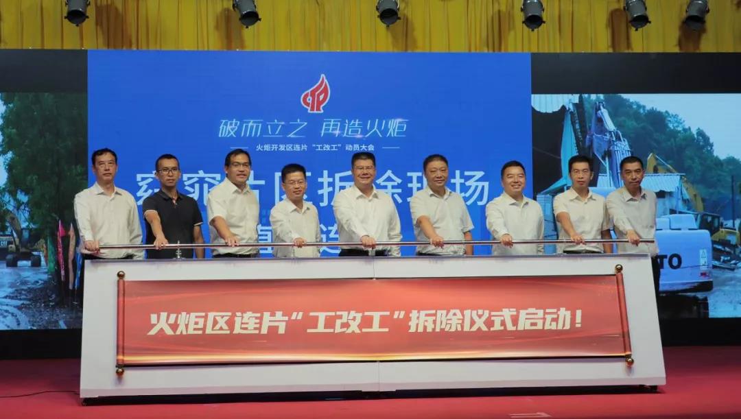 在火炬区“工改工”动员大会上,市委副书记、火炬区党工委书记陈文锋,副市长高瑞生,区党工委副书记、管委会主任黎炳盛,市自然资源局、工业和信息化局、城市更新局负责人等启动火炬区连片“工改工”拆除仪式。拆除现场情况通过视频直播方式连线至大会现场。