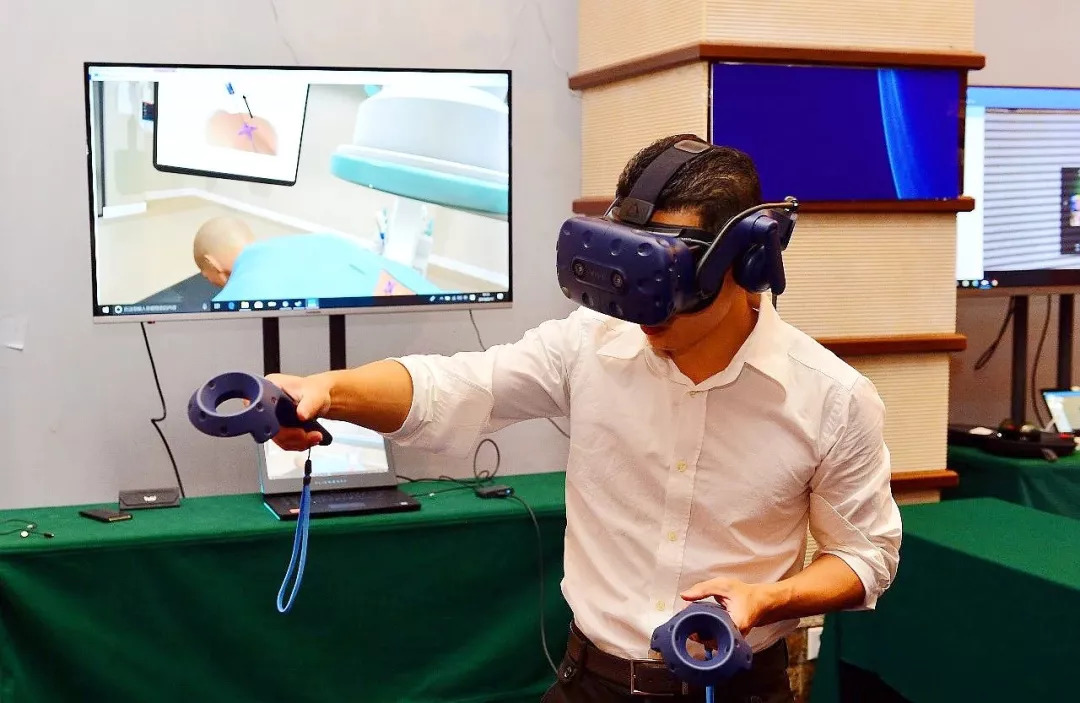 一名操作者双手各握一只手柄,头戴VR眼镜,对着面前的显示屏小心翼翼地、凭空进行着“阑尾切除手术”。只见他转过身去,动了动手中的手柄,屏幕内的手中便出现了一个镊子。操作者通过移动手柄,用手中的“镊子”夹起一块消毒棉花在患者身上开始进行大面积消毒。随后,操作者又转了转手,屏幕上的镊子便转换为手术刀,在患者的皮肤上划开一个口子……操作过程中若是出现了失误,系统还会及时提醒,要求操作者停止动作。