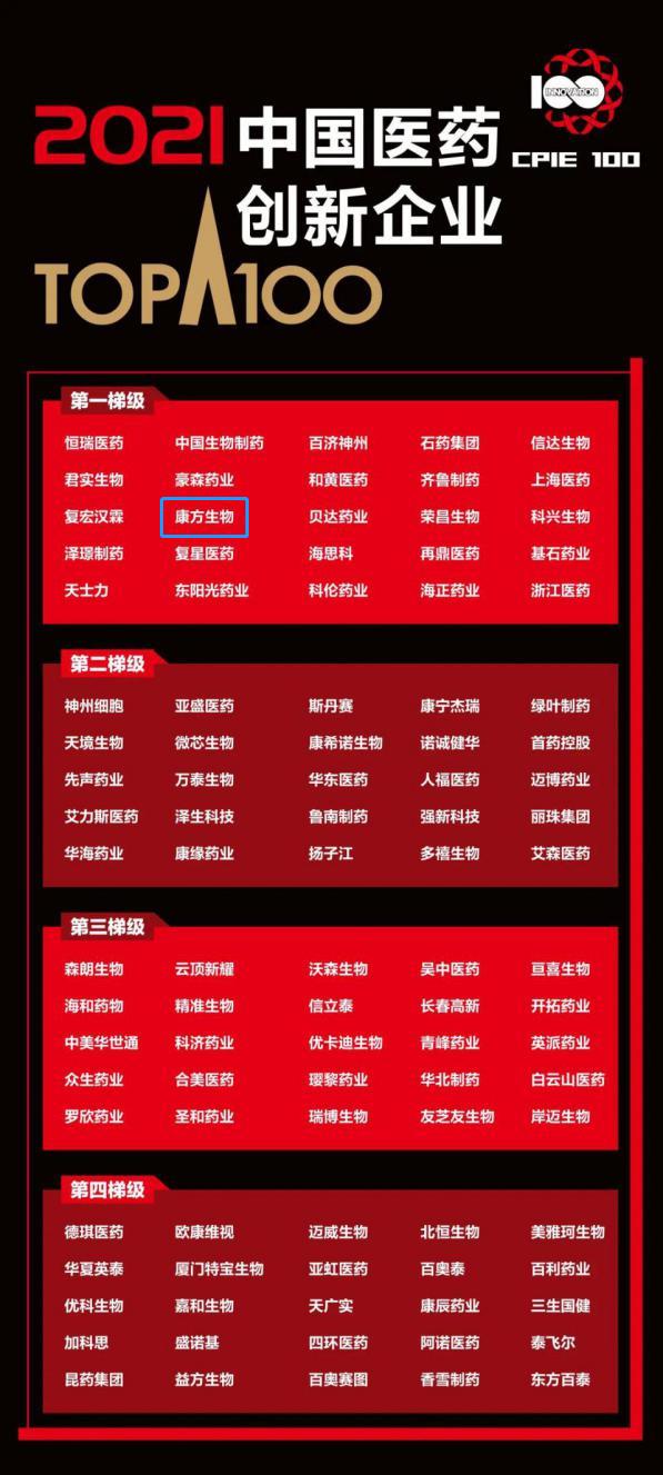 康方生物入选“中国医药创新企业100强”第一阶梯
