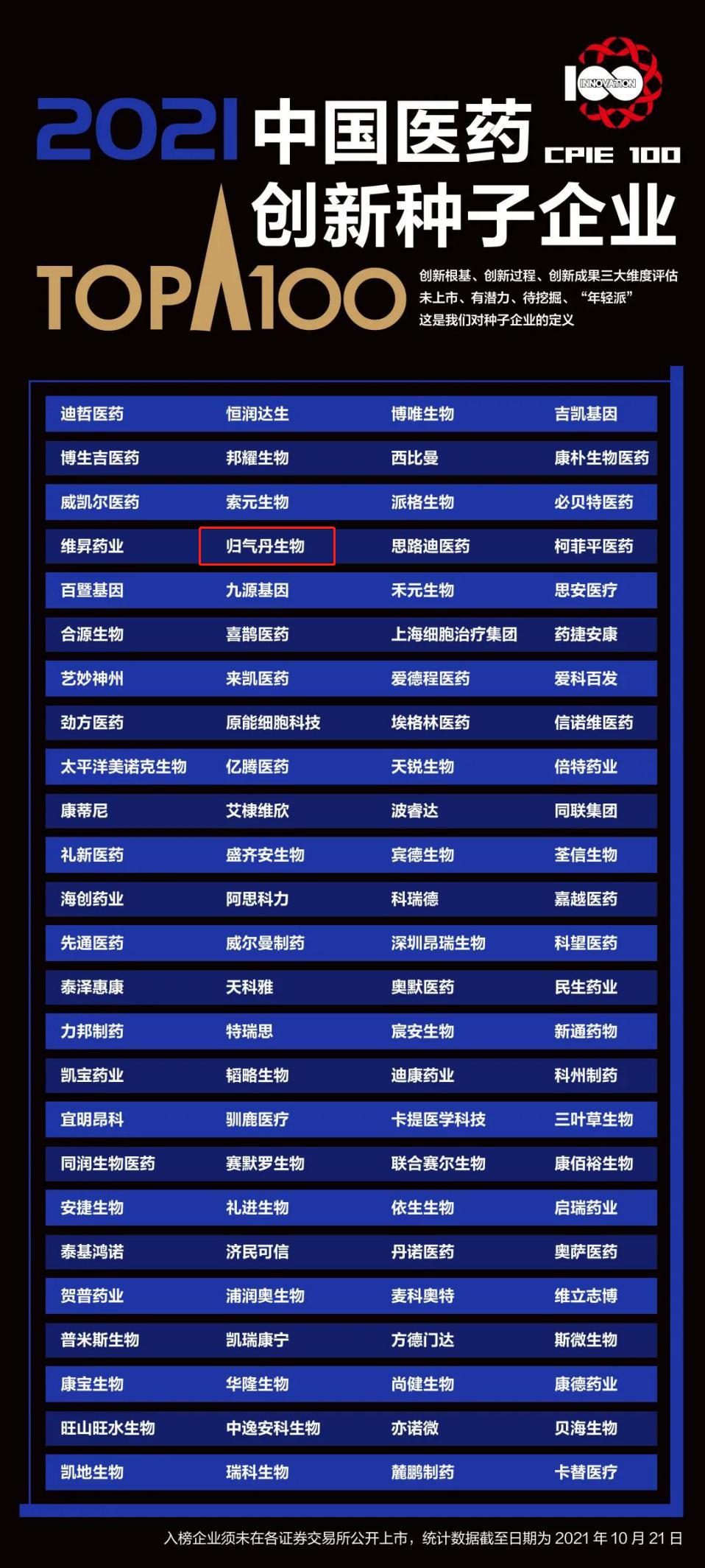 归气丹生物入选“2021中国医药创新种子企业100强”