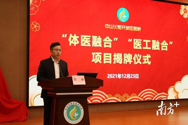 火炬开发区医院党委副书记陈华介绍了“体医融合”及“医工融合”项目的合作背景。他表示,两个项目,都是医院跨界创新的探索,都是造福群众的健康项目。首先,体医融合响应国家健康中国战略,中山市体育竞赛与国民体质监测中心和中山火炬开发区医院将积极开展关于体医合作模式的交流和探讨,发挥各自在健康促进、慢性病预防和伤病康复等方面的专业优势,强强联合,共建“中山市体质测定与运动健身指导站”和“体医融合”运动康复基地。其次,医工融合是贯彻“健康中国”国家战略的切实行动,也是火炬开发区医院创三甲的现实需要,医院在重点学科建设上已有新突破,需要更多科研成果及转化,同区域的国家健康科技产业基地拥有几百家生物医药企业,整合“医”+“工”资源,利用“医”+“工”优势,增加科研项目合作、加速科研成果转化,是实现医工协同、共谋医学科研与产业共同发展的路径。