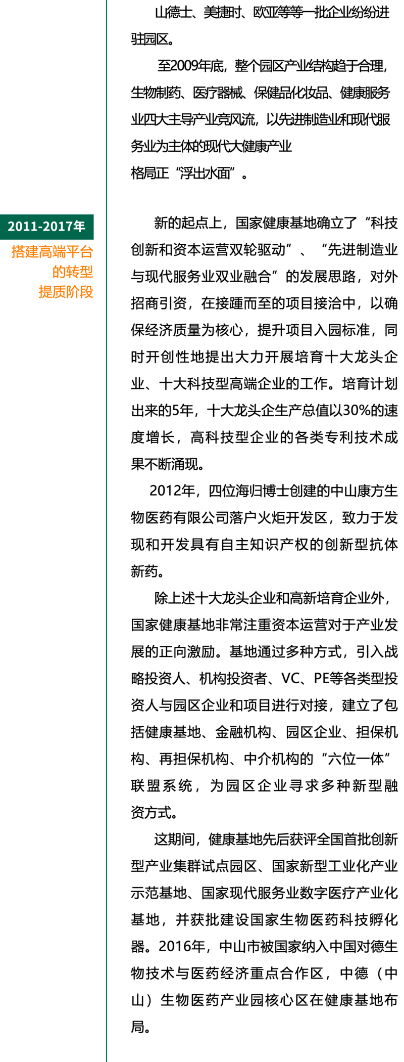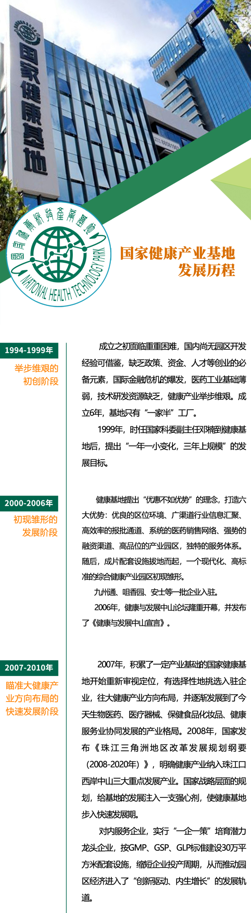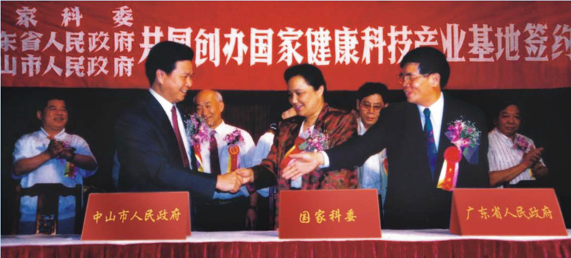 1992年1月,中美两国在华盛顿联合签署了《关于知识产权保护的谅解备忘录》。国际环境的变化,要求中国必须拥有具有自主知识产权的创新药物,否则必将在未来的经济角力中吃亏。而这也同时意味着,在中国建设一个按照国际创新药物标准的新药研究、开发和生产基地,显得迫切而重要。有山有水有码头、离港澳近的中山赢得了这次机会。1994年,时任国家科技部副部长邓楠、广东省副省长卢钟鹤、中山市市长汤炳权分别代表国家科委、广东省人民政府和中山市人民政府,在中山正式签署协议,由三方共建当时国内唯一的国家级健康科技产业基地,这标志着中国的自主新药研发和产业化从此在健康基地迈入征途。