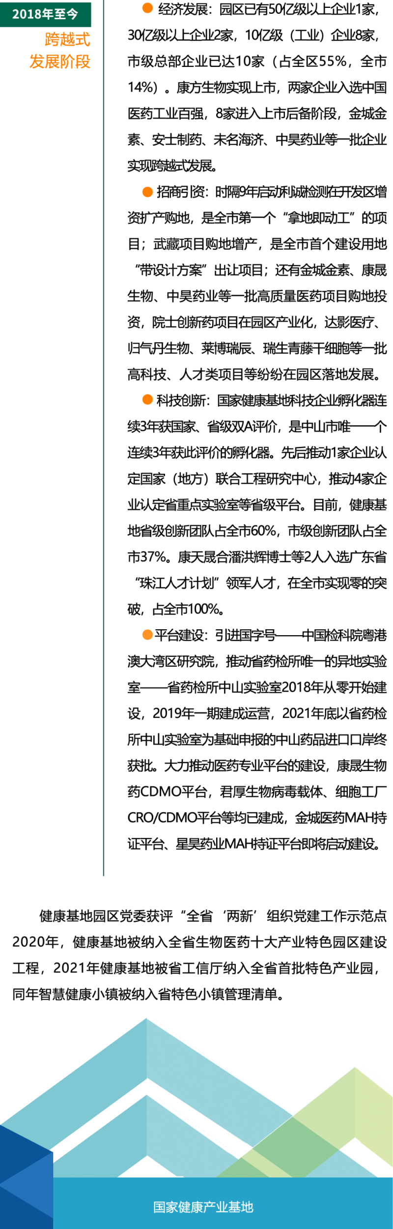 心中有梦,奋斗为桨。面对“双区驱动”重大历史机遇和深中通道加快建设的重要窗口期,健康基地将抢抓机遇、乘势而上,依托中山药品进口口岸和中国检科院粤港澳大湾区研究院等产业平台,构建智慧健康小镇、湾西智谷、东利工改工片区“三点一面”的万亩健康产业园和民众沙仔万亩原料药绿色制造和智能制造示范园区,招大商大招商,促进园区企业数字化智能化转型实现高质量发展,助力中山早日实现千亿健康产业集群。