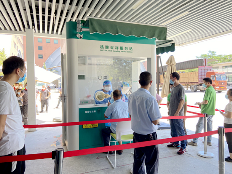 面对高温酷暑,如何改善户外核酸采样条件?7月13日,国家健康基地园区内的广东领先展示股份有限公司(以下简称“领先展示”)厂区多了一个“核酸采样服务站”,医护人员在采样服务站内便可帮助员工更高效、更安全完成采样。
