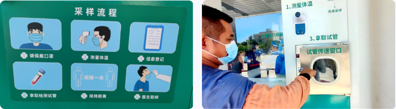 除此之外,“小屋”的外部还配置测温器、扫码器、试管传递窗口、扩音器等便民设施,以及医疗废物放置柜、试管放置柜、试管架放置处、手部消杀等采样配置,功能齐全。
