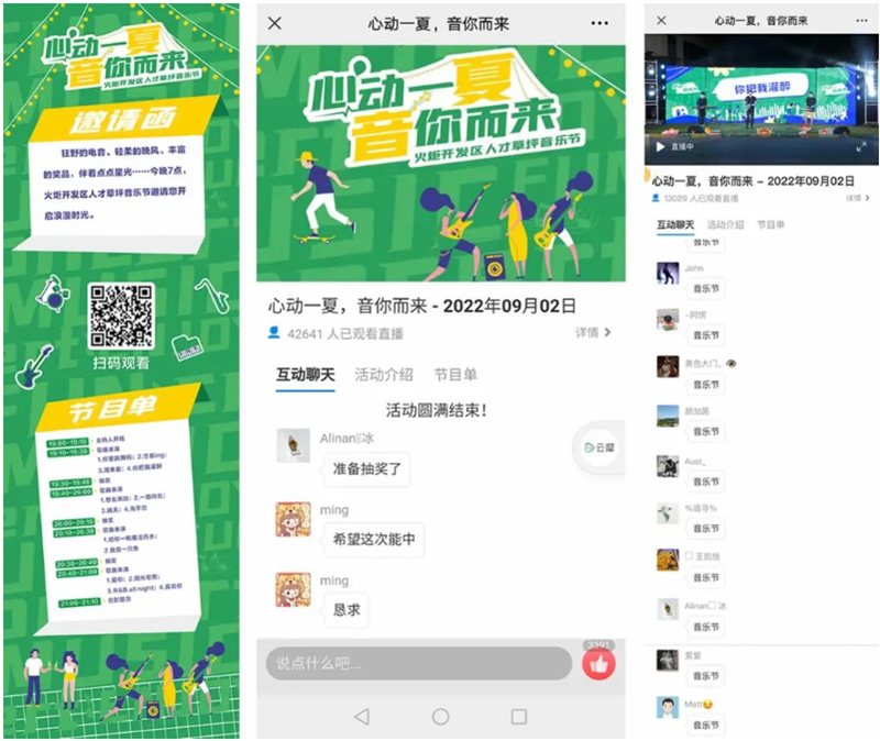 此次草坪音乐节采取线上直播+互动的形式举办,不仅邀请了麦靠北乐队和三陈乐队现场助兴,唱响了14支优美曲子,还穿插了抽奖环节,开发区人才交流群也在同步互动,吸引了区内来自星昊药业、金城金素、利诚检测、康天晟合、艾一生科、金马游乐、明阳智能、中铁装备集团、蓝轩氢能科技等企业上百名人才参加、超过4.2万名观众观看了直播。此次活动还得到了商家礼遇中山和有戏世界沉浸式互动影城的抽奖礼品的赞助。