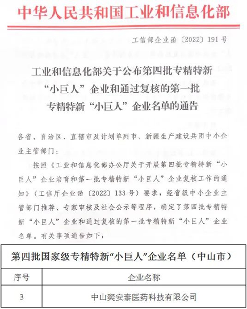 近日,第四批国家级专精特新“小巨人”企业名单发布,健康基地园区企业中山奕安泰医药科技有限公司(以下简称“奕安泰”)榜上有名。一直以来,健康基地把科技创新作为引领发展的第一动力,打造差异化竞争优势,培育了一批有持续创新力和竞争力的优质企业。目前,健康基地还拥有7家省级专精特新企业、2家市级专精特新及单项冠军培育企业。