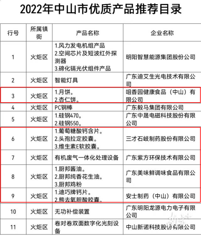 本次上榜的企业基本涵盖了中山市内主要知名企业及其“拳头”产品。如在食品类方面,包括咀香园健康食品(中山)有限公司的杏仁饼、广东美味鲜调味食品有限公司厨邦酱油等。健康医药领域,包括安士制药(中山)有限公司的迪巧牌钙片、三才石岐制药股份有限公司的葡萄糖酸钙含片;工业产品领域,包括广东紫方环保技术有限公司有机废气一体化处理设备等。