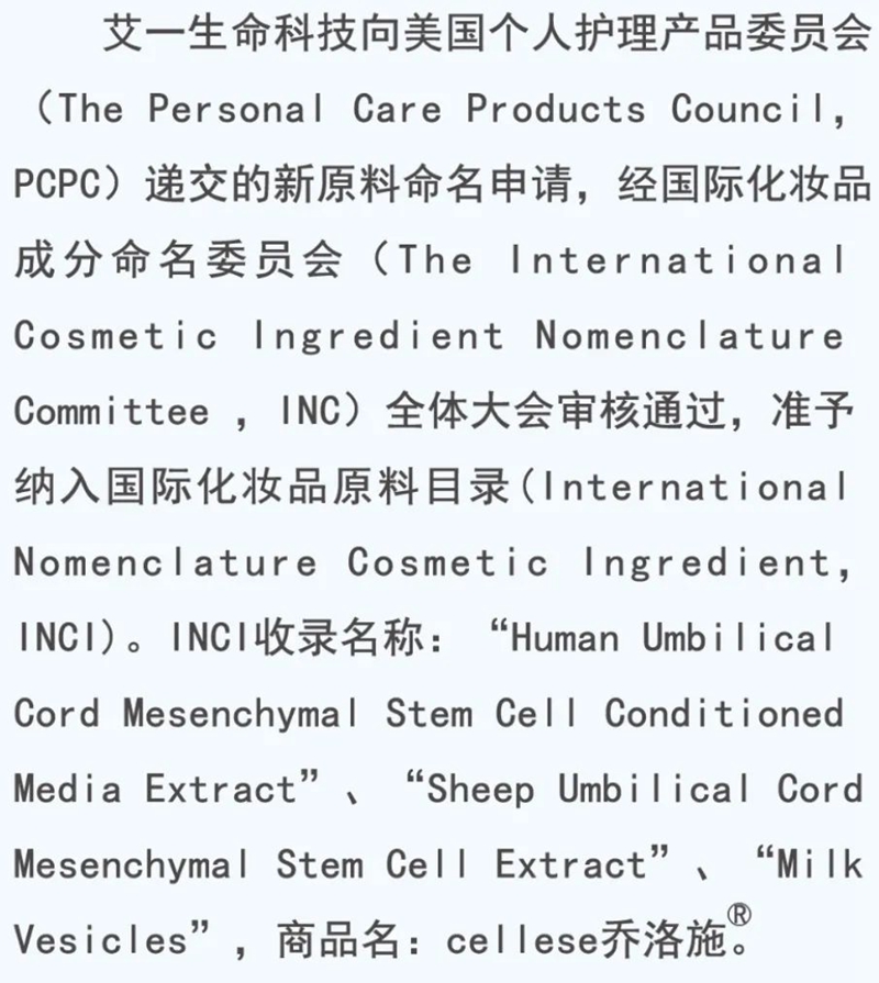 此次INCI的批准许可申请,艾一生命科学凭借严苛的产品标准、卓越的质量水平及安全有效等多重优势,历经重重验证审核终获成功,吸引了全球医学界的关注。艾一生命科技计划将为全球提供人脐带间充质干细胞外囊泡的原料及相关功效化妆品,让更多人受益于乔洛施的皮肤再生和防止老化。此次获批,也得益于艾一生命科技科研团队的潜心研究、不懈创新,彰显了其团队在人脐带间充质干细胞外囊泡科研领域的“硬核”实力。