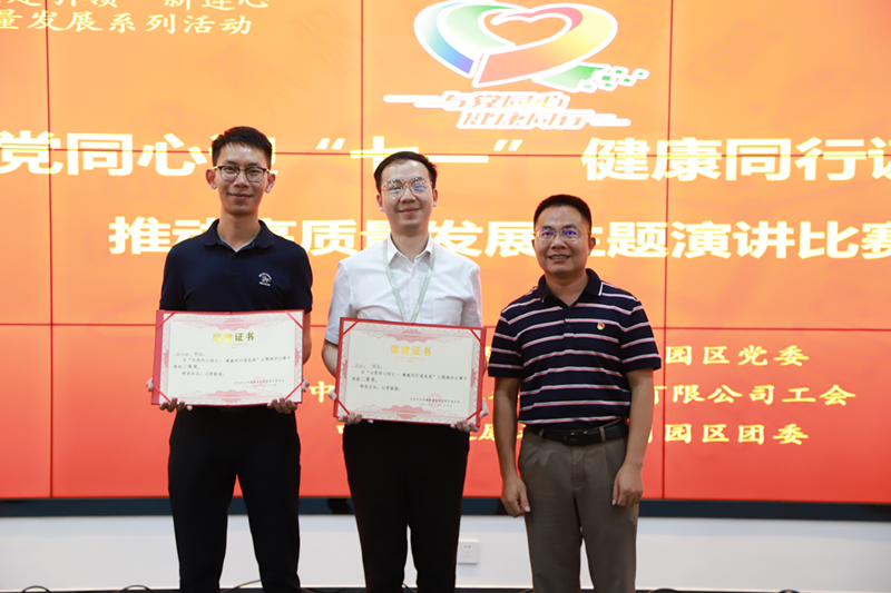 火炬开发区党群服务中心主任李慧为二等奖获得者林伟潮(民众沙仔园区发展部)、郑皓文(科技创新部)颁奖