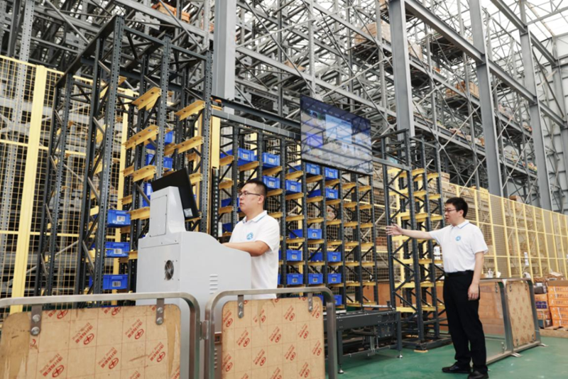 条码识别后,货物经过环线穿梭车(RGV)实现自动存放;AGV协助入库货物实现全自主移动;堆垛机将货物迅速从货架取出,并自动输送到分拣区……这是健康基地园区企业广东得友鑫物流系统设备有限公司自主研发生产的自动化立体仓,展示了货物从入库、运输、分拣到出库等全流程的智慧仓储服务能力。