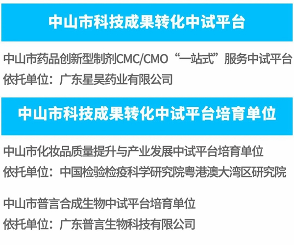 2024年中山市科技成果转化中试平台及培育单位认定名单(健康基地园区)
