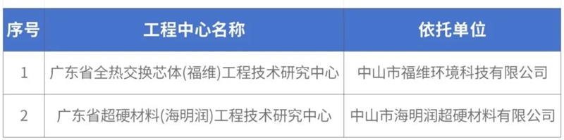 近日,广东省科学技术厅公布了2024年度广东省工程技术研究中心认定名单,健康基地园区两家企业中山市福维环境科技有限公司和中山市海明润超硬材料有限公司凭借突出技术创新能力和研发实力,成功通过认定。