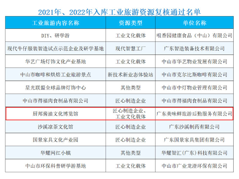 广东工业旅游资源复核近日,广东省工业和信息化厅、广东省文化和旅游厅联合公布了2024年广东省工业旅游培育资源库入库名单及2021年、2022年入库工业旅游资源复核通过名单。健康基地园区企业广东美味鲜调味食品有限公司旗下“厨邦酱油文化博览馆”成功通过2021年、2022年入库工业旅游资源复核。