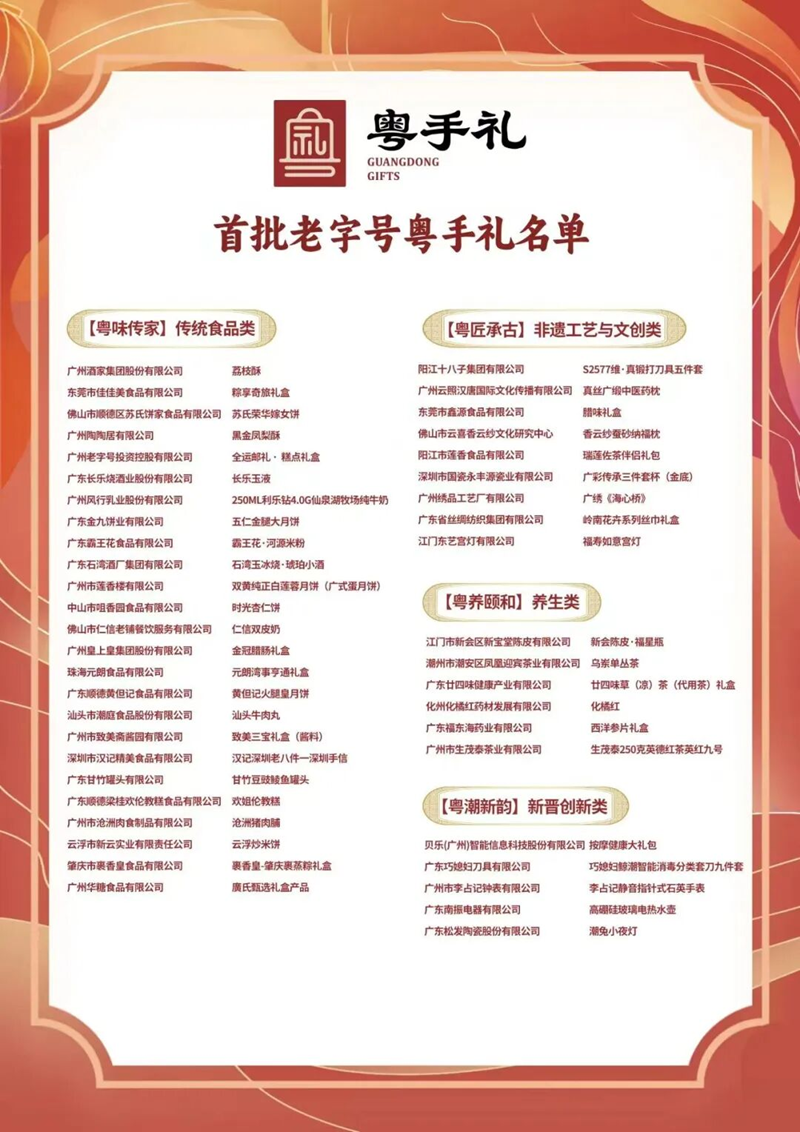 今年8月,为落实《广东省促进老字号创新发展行动方案(2022-2025)》要求,促进广东老字号企业推出更多具有地域特色、文化内涵、时代特点的“必购必带”产品,赋能老字号消费,推动老字号品牌升级,助力“粤品出粤”,提升“粤手礼”产品的市场竞争力和品牌影响力,在广东省商务厅、广东省文化和旅游厅的指导下,广东省老字号协会对“粤手礼”进行产品征集、资格初审、专家评审、综合考评等多个环节的层层筛选。涵盖“粤味传家”传统食品类、“粤匠承古”非遗工艺与文创类、“粤养颐和”养生产品类、“粤潮新韵”新晋创新品类等,共计四大品类45件产品入围。