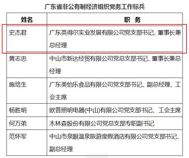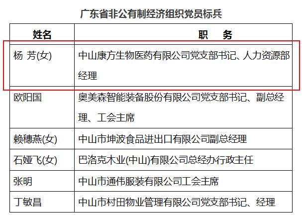 6月27日,广东省非公有制经济组织党建工作座谈会在广州召开,总结全省非公经济组织党建工作,选树一批先进单位和个人。其中,中山市共有6个非公企业党组织获奖,12名先进个人获奖。在这其中,健康基地园区企业康方生物医药有限公司党支部书记杨芳和广东英得尔实业发展有限公司党支部书记、董事长兼总经理史杰君分别获得“广东省非公有制经济组织党员标兵”和“广东省非公有制经济组织先进党组织”。