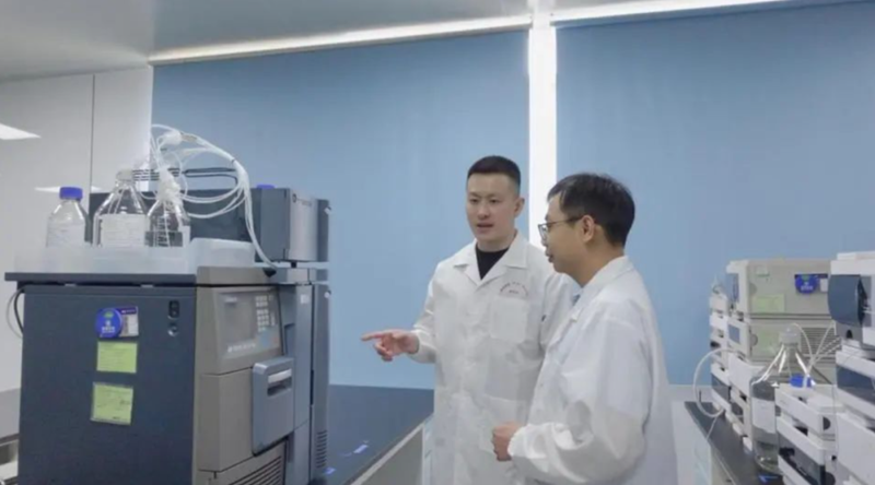 安士制药董事、副总经理陈耕(左一)与研发人员探讨交流