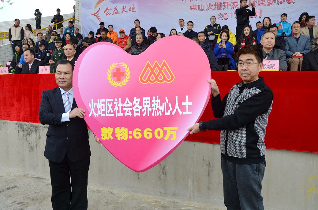 咀香园健康食品(中山)有限公司首席技术官张延杰代表火炬区社会各界热心人士向火炬区红十字会捐赠款物660万元