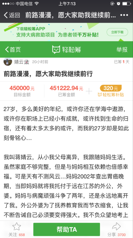 10小时的陆续接力,小蒋的筹款超过了预设金额45万元。那一刻,我们悄悄松了一口气:只愿我们的行动能如熹微曙光,照耀她前行的路。