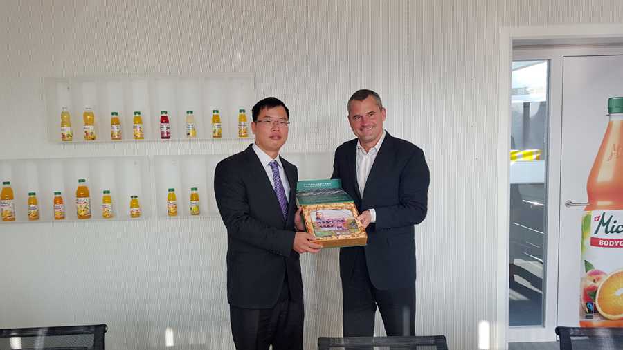 瑞士当地时间10月20日上午,由中山市食品药品监督管理局副局长曾德强带队,国家健康基地副总经理林霞等中山经贸代表团一行参观考察位于瑞士Rothrist的Rivella公司。
